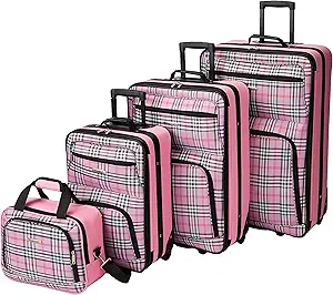 This beautiful deluxe 4-Piece expandable luggage set is manufactured with a patented heavy duty EVA-molded hi-count fabric. This set is perfect for the serious and experienced traveler! Manufactured with the very best heavy duty polyester and PVC backing, this luggage set is designed for the traveler on the go and comes with three expandable uprights and a flight tote bag. It comes packed with features including: an inside retractable handle, EZ-Roll in-line skate wheels, back zippered secured pockets, top and side comfort grip handle, stability bars at the bottom to avoid tilting, and locks & keys. Upright features include: